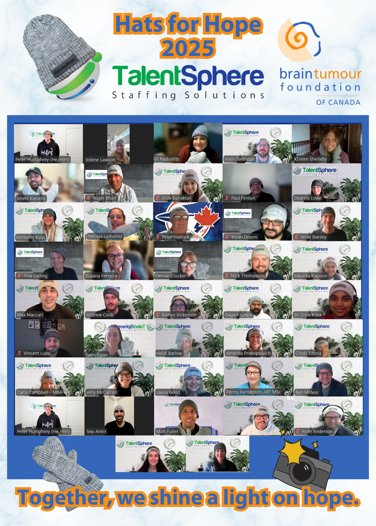 For several years, TalentSphere has proudly supported Hats for Hope, a fundraising initiative dedicated to brain tumour awareness and research. This year, we continue that tradition—purchasing hats to help raise awareness and spread hope.